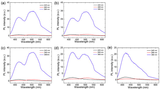 Photoluminescence (PL) spectra from GQD solutions obtained after two filtration modes. (a,b) PL spectra from (a) feed and (b) permeate solutions in dead-end filtration. (c–e) PL spectra from (c) feed, (d) retentate, and (e) permeate solutions in cross-flow filtration. The feed solutions used in two filtration modes was prepared by the same synthetic methods of GQDs.
