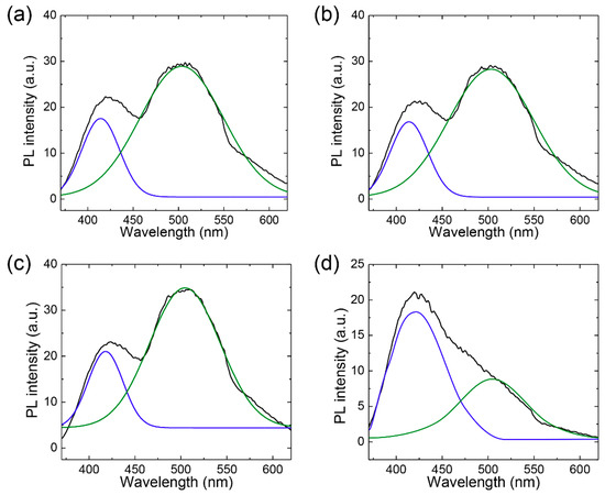 Peak deconvolution in photoluminescence spectra excited at 368 nm. (a,b) PL spectra from (a) feed and (b) permeate solutions in dead-end filtration. (c,d) PL spectra from (c) feed and (d) permeate solutions in cross-flow filtration.