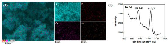 Energy-dispersive X-ray spectroscopy (EDS) mapping for the distribution of Si, P, Ca, and Eu in the 1 Eu/MBGs (A), and Eu high resolution X-ray photoelectron spectroscopy (XPS) spectrum of 2 Eu/MBGs (B).
