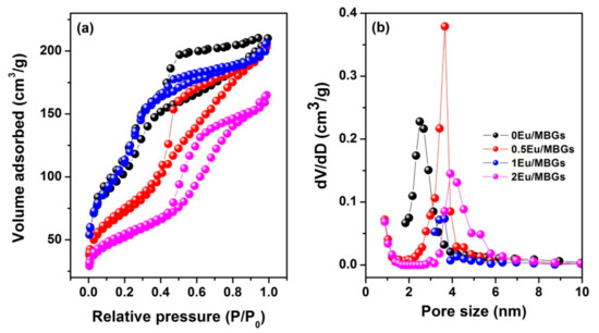 Nitrogen adsorption-desorption isotherm (a) and mesopore pore size distribution (b) of Eu/MBGs.