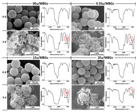 Figure 4 shows FTIR spectra and SEM micrographs of Eu/MBGs after soaking in SBF solution for 0 and 3 days. The scope of the FTIR analysis is on the wave numbers between 400 and 1800 cm−1 because the main vibration peaks associated with apatite in the Eu/MBGs samples are in this region. Apatite formation is an important characterization closely related to bioactivity of biomaterials. As exhibited in the FTIR spectra, the 400–1000 cm−1 region matches the bands caused by the bending vibrations of Si–O bonds in SiO4 tetrahedral, which are centered at ~469 cm−1 and ~799 cm−1, respectively. After soaking in SBF, the two Si–O bands become sharper. Meanwhile, new peaks assigned to crystalline calcium phosphate appeared at wave numbers of 604 and 563 cm−1 in the patterns for 0 Eu/MBGs, 0.5 Eu/MBGs and 1 Eu/MBGs, but not except 2 Eu/MBGs, after soaking in SBF solution for 3 days, indicating the formation of apatite on the surface of Eu/MBGs [25,26]. As shown in the SEM micrographs, coarse spherical surfaces with microscopic pores were observed in all the Eu/MBGs samples before soaking. After soaking for 3 days, some sheet-like apatite is deposited on the surface of Eu/MBGs with low Eu content (0–0.5%). However, with high Eu content (1–2%), some worm-like apatite is found on the surface of Eu/MBGs. It can be observed that the morphology of these mineralized apatite shows noticeable differences among the four Eu/MBGs with different doping Eu content.