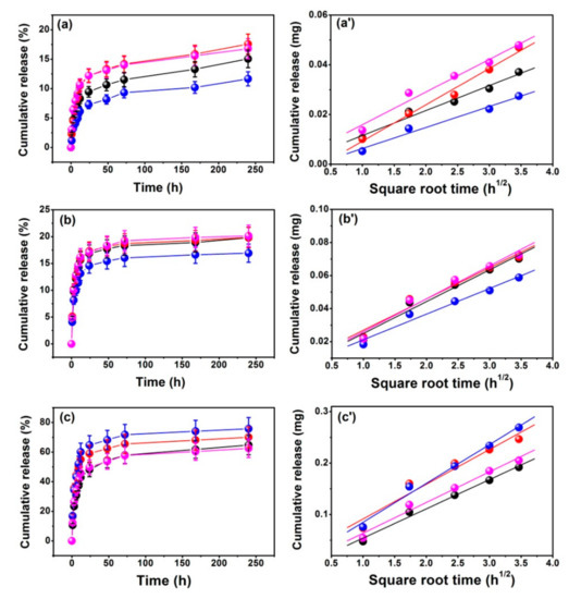 Cumulative release of doxorubicin (DOX) from Eu/MBGs in PBS with different pH values (a–c) and fitted to the first 12 h of data by the Higuchi model (a’–c’). (a,a’) DOX release at pH 8.6, (b,b’) DOX release at pH 7.4, (c,c’) DOX release at pH 4.3; black “●” symbols 0 Eu/MBGs; red “●” symbols 0.5 Eu/MBGs; blue “●” symbols 1 Eu/MBGs; magenta “●” symbols 2 Eu/MBGs.