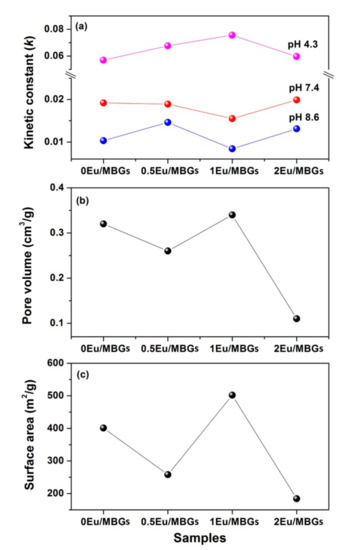 Kinetic constant (a) and microstructure parameters (surface area (b) and pore volume (c)) of Eu/MBGs.