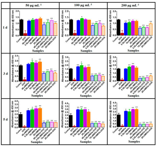 Meanwhile, the effect of Eu ions and DOX from MBGs on the osteosarcoma MG 63 cell viability was also examined using CCK-8 assay by culturing for 1, 3 and 5 days. According to Figure 7, cell viability of MG 63 decreased gradually with increasing culture time and added concentrations of Eu/MBGs-DOX. Obviously, the Eu/MBGs-DOX possesses a relatively higher cell viability of MG 63 compared with DOX due to the cooperative effect of Eu ions and DOX from MBGs (p < 0.01). The results also indicate that the controlled release of DOX delivery from the Eu/MBGs is favorable to maintain a long-term inhibitory effect on the viability of osteosarcoma MG 63 cells.