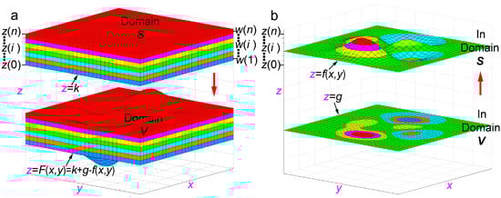For any given function z = f(x, y) (a ≤ x ≤ b, c ≤ y ≤ d) in the 3-D domain S (Figure 1b), and two positive numbers k and g (let k = z(0) and k > g), we establish a mathematic transformation Q:(x, y, z) → (x, y, z + g − f(x, y)). V(i) represents the corresponding domain of S(i) under the transformation Q and let V = ∪ V(i), (i = 1, 2, …, n) (Figure 1a). Thus, Q is a mathematical transformation from one 3-D domain S to another 3-D domain V (Figure 1a). Specifically, the z = f(x, y) in the domain S is transformed into z = g in the domain V via the transformation function Q, while z = k is transformed into z = k + g − f(x, y) (Figure 1a).