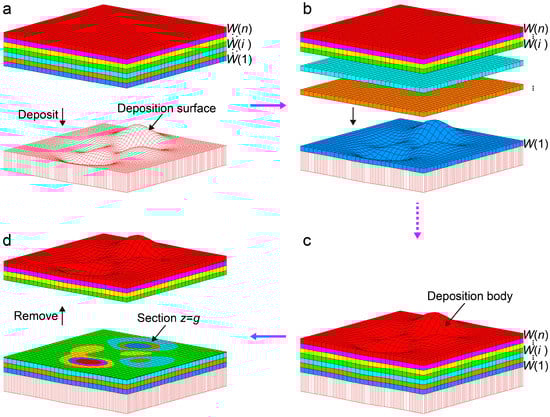 As shown in Figure 1a, we assume that S(i) is a three-dimension (3-D) domain (a ≤ x ≤ b, c ≤ y ≤ d, z(i − 1) < z ≤ (i)), (i = 1, 2, …, n), and let S = ∪ S(i). Each domain, S(i), is filled with one type of material recorded as W(i), and the thickness of S(i) (numerically equal to W(i)) is given by h(i) (h(i) = z(i) − z(i − 1)). Therefore, the domain S can be seen as a lamellar body of the same material layer S(i) (i = 1, 2, …, n).