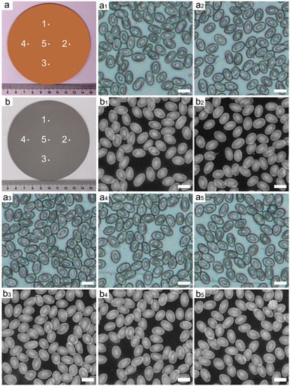 Comparison of the morphology of erythrocyte on quartz and actual distribution of different ratios of aluminum and tungsten metals. (a) Digital image of substrate formed by spin-coating of the erythrocytes on a quartz substrate. (a1–a5) Optical images taken on the marked areas of quartz substrate. (b) Digital image of the actual distribution. (b1–b5) BSE images of the actual distribution corresponding to the (a1–a5). All bars are 10 μm.