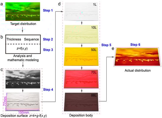 Distribution of a landscape photo via LMP-method. (a) Target distribution, a random digital photo of landscape with the length × width of 150 × 77 mm2. (b) Analysis and mathematic modeling to determine deposition sequence, thickness of each layer, and a function of z = f(x, y). (c) Fabrication of deposition surface (z = k + g − f(x, y)) via carving technology according to grayscale image of the photo. (d) The implement of deposition process, selected photo is the first 1, 10, 50, 70, and 88 layer, respectively. The deposition body is formed after the deposition of 88 layers. (e) Actual distribution obtained from a certain section (z = g) through machining the deposition body.