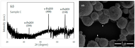 X-ray diffraction (XRD) spectrum of the sample heated (a) at 300 °C for 12 h without the external force; (b) at 300 °C for 1.5 h under the external force; (c) at 300 °C for 12 h under the external force; (d) SEM image of sample B. White arrows in (d) indicate the nanowires on the iron particle.