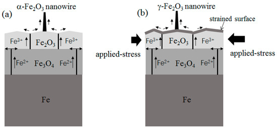 (a) Schematic diagram of α-Fe2O3 nanowire growth without the external force; (b) schematic diagram of γ-Fe2O3 nanowire growth under the external force.