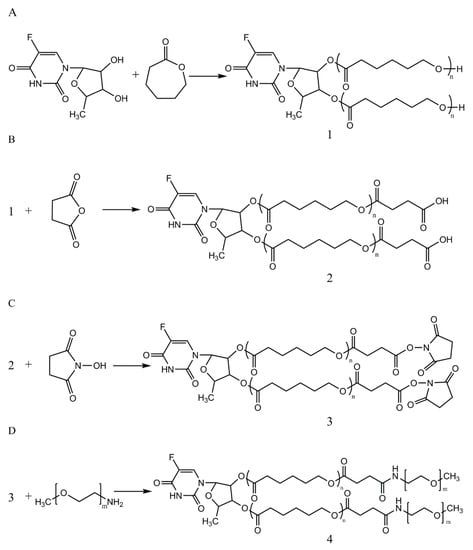 Synthetic scheme of (A) 5’-DFUR-PCL, (B) 5’-DFUR-PCL-COOH, (C) 5’-DFUR-PCL-NHS, and (D) 5’-DFUR-PCL-MPEG.