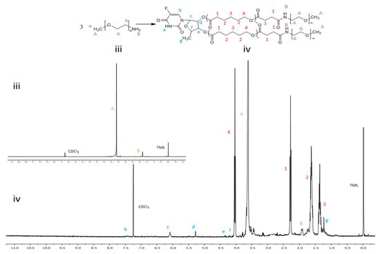 1H NMR spectra of (iii) MPEG and (iv) 5’-DFUR-PCL-MPEG.