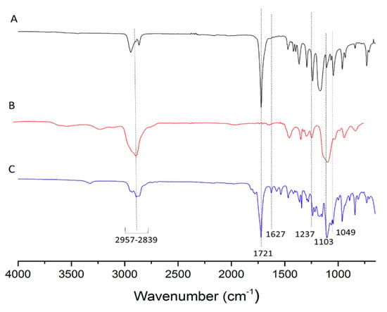 FT-IR was used to show the grafting of MPEG to 5’-DFUR-PCL-NHS (Figure 1D). FT-IR spectra of 5’-DFUR-PCL (A), MPEG-NH2 (B) and 5’-DFUR-PCL-MPEG (C) are shown in Figure 4. C-H stretching vibrations are observed from 2957–2839 cm−1 for all samples. FT-IR absorption peaks of PCL and MPEG at 1721 cm−1 attributed to the C=O stretching and at 1103 cm−1 of the C-O-C, respectively, were seen in the FT-IR spectra. These peaks, as well as characteristic peaks contributed from 5’-DFUR such as C-F stretching at 1049 cm−1, C-N stretching of the primary and secondary aromatic amine at 1627 and 1237 cm−1 were all found in Figure 4A,C, showing successful initiation of polymerization of ε-CL by 5’-DFUR.