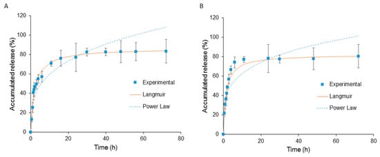 The release of 5’-DFUR from 5’-DFUR-PCL-MPEG was modeled using both Power Law and Langmuir models as shown in Figure 6A,B. The Power Law model was not a good fit for the release of 5’-DFUR from polymeric prodrug micelles. Here, we obtained an exponent, n, value equal to 0.24 and 0.30 with and without esterase, respectively. If n is 0.43, for a sphere, this would indicate Fickian diffusion [50]. Due to the fact that our release is not solely though diffusion (i.e., 5’-DFUR is chemically bound to PCL though ester bond), our release is reaction diffusion. Here, the prodrug 5’-DFUR, is released through hydrolysis (Figure 6B) or a combination of hydrolysis and esterase (Figure 6A). Therefore, we chose to also model our data with the Langmuir model. The Langmuir model is an enzyme kinetics model, and as can be seen in Figure 6, a good fit for the release of 5’-DFUR from polymeric prodrug micelles. The dissociation constant (Kd) for the release of 5’-DFUR from 5’-DFUR-PCL-MPEG was found to be 1.48 and 3.07 with and without esterase, respectively.