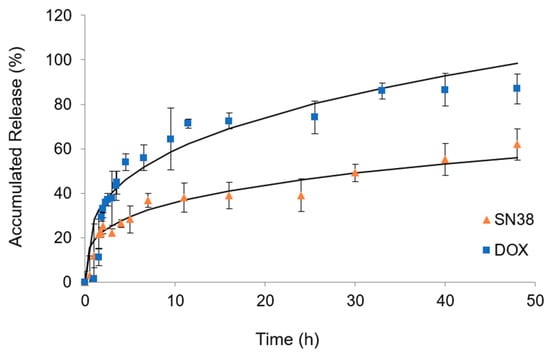 The release of DOX and SN-38 at 37 °C in 5’-DFUR-PCL-MPEG is shown in Figure 7. The release profiles showed that a cumulative release of DOX and SN-38 from 5’-DFUR-incorporated micelles in PBS at 37 °C was up to 87% and 62%, respectively, after 48 h. Moreover, we modeled the data using the Power Law and it was found to be a good fit for both of the encapsulated chemotherapeutic drugs. For the release of DOX and SN-38, we obtained n values of 0.41 and 0.43. These values are very close to the exponent value n (0.43) for the Fickian diffusion of a sphere, indicating that Fickian diffusion is most likely the release mechanism for encapsulated chemotherapy drugs DOX and SN-38.