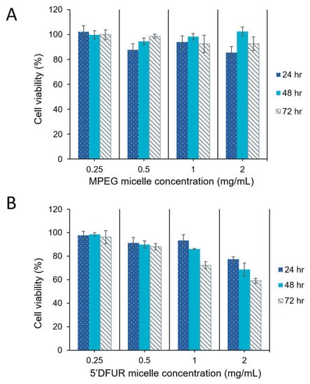 Cell viability of HT-29 cells after treatment with polymeric micelles for 24, 48, and 72 h. (A) MPEG350-PCL-MPEG polymeric micelles, (B) 5’-DFUR-PCL-MPEG polymeric micelles (mean ± SD, n = 3).