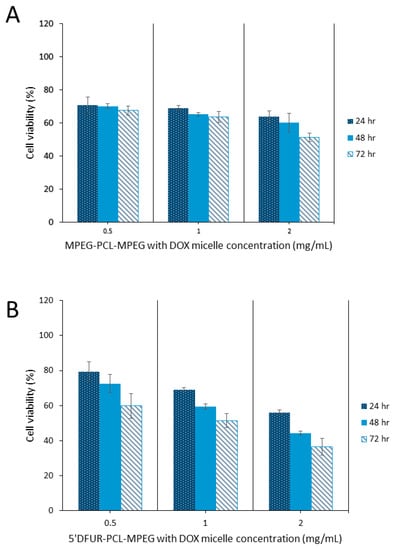 Cell viability of HT-29 cells after treatment with polymeric micelles encapsulating DOX for 24, 48, and 72 h. (A) MPEG350-PCL-MPEG polymeric micelles, (B) 5’-DFUR-PCL-MPEG polymeric micelles (mean ± SD, n = 3).