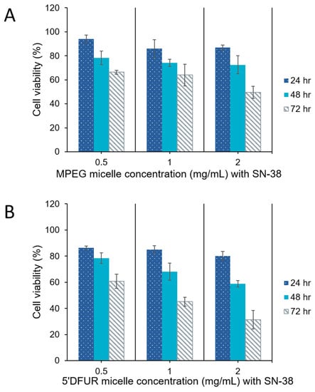 Cell viability of HT-29 cells after treatment with polymeric micelles encapsulating SN-38 for 24, 48, and 72 h. (A) MPEG350-PCL-MPEG polymeric micelles, (B) 5’-DFUR-PCL-MPEG polymeric micelles (mean ± SD, n = 3).