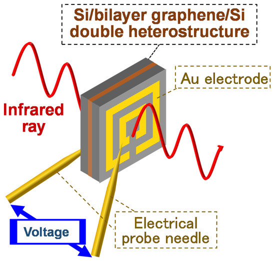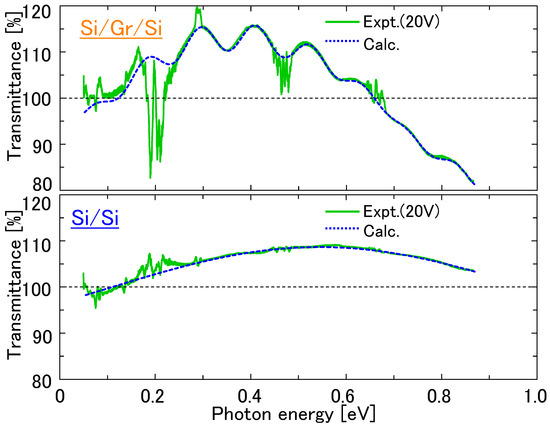 In the second part of this work, the functionality of the structure was demonstrated by attempting to generate and tune the graphene bandgap energy through application of an electrical bias voltage. Bilayer graphene [30] was used as the core material in the Si-cladded double heterostructure. Graphene bandgap energy is known to be detectable via observation of absorption peaks in transmission spectra [30]. According to Reference [30], bias voltages were applied in the normal direction of the planar Si/bilayer graphene/Si double heterostructures, and the measured optical transmission in the normal direction vertically penetrated the samples. Figure 1 depicts a conceptual drawing of the measurement system. Optical measurements utilizing Fourier-transform infrared spectroscopy (FTIR, PerkinElmer, Waltham, MA, USA) were conducted to observe the graphene bandgap. Attempts were made to detect the existence of the absorption peak induced by the bandgap energy, by eliminating optical interference from the acquired transmission spectral data using the after-mentioned theoretical calculations. Due to facility limitations, measurements were conducted in ambient air at room temperature in the photon energy range from 0.05 to 0.85 eV and applied bias voltage from −20 to 20 V. To clarify the change in transmission spectra induced by the bias voltage, the raw transmission spectra data obtained with bias voltage, V, were normalized to that without electrical bias (i.e., V = 0).