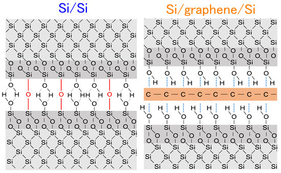 The measured interfacial bonding strength of the Si/graphene/Si structure (~30 kPa) was drastically reduced when compared to the Si/Si control structure without graphene (~650 kPa). To investigate the origin of this interfacial strength difference, an FTIR measurement was conducted on the Si/graphene/Si double heterostructure containing bilayer graphene, as the Si wafer used for monolayer graphene was not transparent. Absorption peaks for covalent Si–C and Si–O–C bonds [31] were not observed in the measurement, as seen in Figure 4. Figure 5 depicts a conceptual schematic of a cross-sectional molecular view of the bonded interfaces. It is known that covalent oxygen bridges are partially formed at the directly bonded Si/Si interface, therefore enhancing the bonding strength [20,21]. Alternatively, when graphene is present, interfacial covalent bonds do not form and the primary bonding forces include van der Waals interactions and hydrogen bonds. These interfacial chemical bonding differences are hypothesized to be the cause for mechanical strength differences in the Si/graphene/Si structure relative to the Si/Si control.
