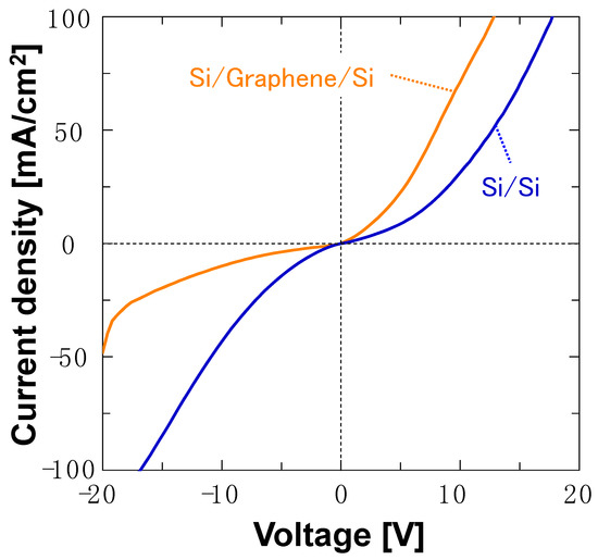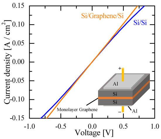 Figure 6 and Figure 7 show the room-temperature current-voltage characteristics of the Si/monolayer graphene/Si and Si/bilayer graphene/Si double heterostructures, respectively, compared to the Si/Si control sample with the same doping-concentration Si wafer for each. The interfacial electrical resistivity across the Si/monolayer graphene/Si structure was less than 5 Ω cm2, and comparable to that for the corresponding Si/Si control, as seen in Figure 6. Thus, a favorable electrical interlayer conductance has been obtained in the bonded Si/graphene/Si double heterostructure. The Si/bilayer graphene/Si double heterostructure exhibited a diode-like, rectified current-voltage curve, similar to that of the corresponding Si/Si control, as shown in Figure 7. This result is consistent with the existing reports that graphene/Si interfaces have Schottky-contact characteristics (for Si with regular doping concentrations) [32,33]. It is hypothesized that the asymmetry in the current-voltage curve, seen in Figure 7, for the Si/bilayer graphene/Si structure may be due to property differences between the two graphene/Si interfaces included in the double heterostructure for our samples. It should be noted that the difference in the electrical characteristics between Figure 6 and Figure 7 may not be due to differences between monolayer and bilayer graphene, but simply due to the difference in doping concentrations in the Si wafers used for each sample. In other words, Si with heavy, degenerating doping concentrations, as seen in the Si wafer used for the Si/bilayer graphene/Si structures here, may form heterointerfaces of the ohmic-contact property with graphene due to its metallic characteristics.