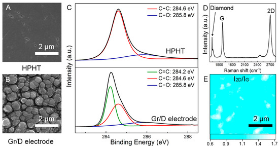 (A,B) SEM images and (C) XPS spectra of the high pressure high temperature (HPHT) and G/D electrode. (D) Raman mapping profile of I2D/IG in a 5 × 5 μm area. (E) A typical Raman spectrum of G/D.