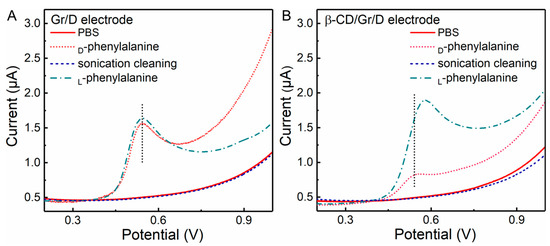 In this work, l and d-phenylalanine were chosen for evaluating the feasibility of a G/D electrode for electrochemical enantiomer recognition. β-CD was chosen as a chiral selector due to its excellent solubility and chiral recognition property [13]. Linear sweep voltammetry (LSV) was used for electrochemical enantiomers recognition. Figure 3 shows the LSV profiles of G/D and β-CD/G/D electrodes for l and d-phenylalanine recognition. It can be seen that 0.1 mM l, d-phenylalanine oxidized at the same potential on the G/D electrode without β-CD modification (Figure 3A). Although the oxidation current of l-phenylalanine was slightly higher than that of d-phenylalanine, it could not be used to identify the type of phenylalanine with an unknown concentration. In contrast, l-phenylalanine and d-phenylalanine were oxidized at different potentials on the β-CD/G/D electrode (Figure 3B), which confirms the G/D electrode can be successfully used for l, d-phenylalanine recognition after a simple β-CD drop casting process. More specifically, the oxidation of l-phenylalanine was observed at 0.576 V with an enhanced current response. This enhancement could be ascribed to the strong interaction between β-CD molecules and l-phenylalanine, which concentrated more L-phenylalanine on electrode surface. This phenomenon is in agreement with other works [14,15]. In contrast, a suppressed oxidation of D-phenylalanine was observed at 0.550 V.