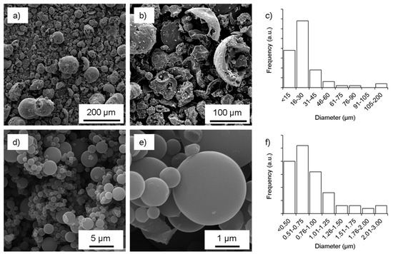 The morphology of sub-micron lignin-derived carbon particles is shown in comparison to carbon particles derived directly from as-received Indulin AT (Figure 1). Characteristically, Indulin AT yields geometrically undefined carbon particles with sizes between 10 µm and 100 µm. The surface of these particles was rough and internal cavities were typical. While a small fraction of particles was spherical, most of them presented irregular shapes. In comparison, sub-micron particles with characteristic size in the order of 50 nm to several 100 nm were nearly perfectly spherical in shape and smooth on the surface (note that wrinkle particles can be obtained with the same setup but were not considered in this investigation [50]). No signs of cavities were observed for these particles and it can be assumed that they were solid.