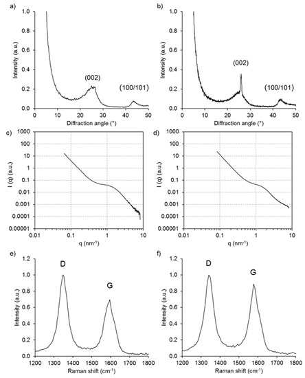 The results of extensive structural characterization of the two types of lignin-derived carbon particles are shown in Figure 2. X-ray diffraction (Figure 2a,b) reveals the presence of graphitic domains in both particle types, as indicated by the characteristic 002 diffraction peak originating from the stacking of graphene sheets in graphite [57]. When comparing the two carbon particles, this peak was more intense for the sub-micron spherical lignin-derived carbon. However, when compared to carbon derived directly from spray dried kraft black liquor in a different study [43], the ordered graphitic character was rather low. In the latter study, unpurified process liquors were carbonized. Small-angle X-ray scattering provides information about the internal pore structure of carbon materials. No significant differences were found in the scattering intensity distribution of the two types of carbon particles tested (Figure 2c,d). The pore radius was 1.09 ± 0.06 nm for Indulin AT carbon and 1.02 ± 0.04 for sub-micron lignin carbon. The corresponding surface area calculated from the scattering curves was 950 ± 140 m2 cm−3 for Indulin AT and 860 ± 100 m2 cm−3 for sub-micron lignin carbon.
