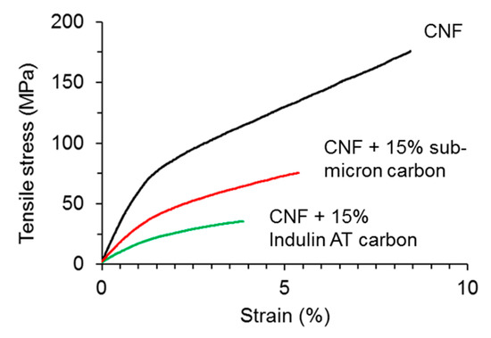 Instead, we evaluated the potential of the carbon particles as fillers in a setup used to assess the suitability of bio-based carbon in the manufacture of cellulose nanopaper for compression sensing. As shown in Figure 4, the presence of 15 wt.% carbon particles in CNF nanopaper significantly diminished the mechanical performance of this material. While pure CNF nanopaper showed a tensile modulus of 6.8 ± 0.32 GPa and strength of 195 ± 19 MPa, these values were reduced to 3.0 ± 0.08 GPa and 75 ± 3 MPa for sub-micron carbon, and 1.7 ± 0.01 GPa and 36 ± 1 MPa for Indulin AT carbon, respectively.