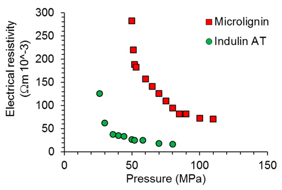 Most remarkably, compared to the values of electrical resistivity determined for the neat carbon powders, the resistivity of carbon-filled cellulose nanopapers was orders of magnitude higher. The nanopapers filled with 15 wt.% carbon showed electrically insulating behavior at the beginning of a compression experiment (Figure 6); electrical current was registered starting from 25 MPa pressure for Indulin AT carbon and from 50 MPa onwards for nanopapers filled with sub-micron lignin carbon. Thus, in principle, composite material configurations such as the carbon-filled nanopaper might serve as compression sensors with moderate sensitivity at high loads, but their practical usefulness has yet to be determined.