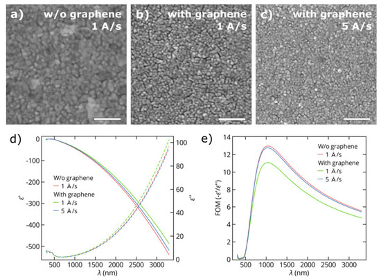 SEM micrographs (scale bars = 200 nm) of thin copper films (25 nm thick) deposited on (a) a SiO2/Si substrate at a rate of 1 Å/s, (b) a graphene/SiO2/Si substrate at a rate of 1 Å/s and (c) a graphene/SiO2/Si substrate at a rate of 15 Å/s. (d) The measured real (solid line) and imaginary (dashed line) parts of the dielectric functions of Cu films on SiO2/Si substrates with and without graphene underlayer. (e) Figures of merit for the same Cu films.