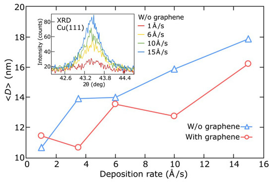 Dependences of the average crystallite size D (using X-ray diffraction (XRD) data) on the deposition rate ranging from 1 to 15 Å/s for thin copper films (25 nm thick) deposited on SiO2/Si substrates with (diamonds) and without (circles) graphene. Intensity enhancement of the XRD peak on the inset illustrates the improved crystallinity of the 25 nm-thick copper films deposited on SiO2/Si substrates without graphene.