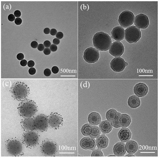 TEM micrographs of synthesized microspheres: (a) SiO2-MPS silica microspheres; (b) SiO2@PMBA microspheres; (c) SiO2@PMBA@Au microspheres; (d) SiO2@PMBA@Au@PNIPAM microspheres.