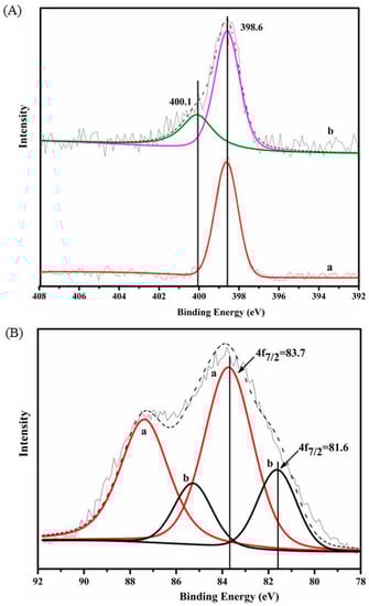To further understand the interaction nature between the amide groups and AuNPs, XPS of Au 4f and N 1s were measured for the as-synthesized microspheres as shown in Figure 5. XPS is an effective method for analyzing the interaction at the interface, in particular for the solid material, which has been extensively used to investigate the interaction between the stabilizer and Au particles [27,28]. Figure 5A showed the XPS spectra of N 1s for SiO2@PMBA microspheres (curve a) and SiO2@PMBA@Au microspheres (curve b), respectively. In curve a, the peak at 398.6 eV corresponded to the N 1s of amide for SiO2@PMBA; while in curve b, two peaks at 400.1 eV and 398.6 eV were found, which represented the N 1s of amide for SiO2@PMBA@Au in two different chemical environments. The large peak at 398.6 eV reflected the majority of the N atoms in PMBA; the small peak at 400.1 eV corresponded to the N atoms in the state of lower electronic density, which provided evidence for the N atoms donating their electrons to the Au atoms after immobilizing AuNPs on the SiO2@PMBA microspheres. For SiO2@PMBA@Au, XPS spectra of the Au 4f core level in Figure 5B showed two groups of peaks, illustrated as group a and group b, respectively. The appearance of these two groups of peaks exhibited that the AuNPs were under two kinds of chemical environments [29]. According to the Au 4f7/2 core level, one peak was located at 83.7 eV (in group a) and the other was at 81.6 eV (in group b). Both of the two peaks for Au 4f7/2 were lower than that of the metallic Au (84.0 eV) [30], which indicated that the AuNPs of SiO2@PMBA@Au had accepted electrons from N atoms of amide groups. The results were consistent with the discussion about N 1s just mentioned above. The peak at 83.7 eV was bigger than the other one at the lower BE. Since the average size of AuNPs was 7 nm in this case, most of the gold atoms were located in the interior of AuNPs, which produced much weaker interactions with N atoms, resulting in a lower BE shift of only 0.3 eV (from 84.0 eV to 83.7 eV) as shown in group a. In comparison, a small number of gold atoms were distributed on the surface of AuNPs, and their interaction with N atoms was stronger, corresponding to a larger BE shift of 2.4 eV (from 84.0 to 81.6 eV) as shown in group b. Therefore, the electron transfer between N atoms of amides and Au atoms of AuNPs determined the interaction nature between the amide groups and AuNPs, which could effectively prevent the aggregation of AuNPs during the formation process, and stabilize the AuNPs for storage and future utilization. In addition, the interaction nature between Au and N on SiO2@PMBA@Au microspheres was further proved by 1H-NMR spectra as shown in Figure S1 (Supporting Information). It was obvious that the sharp signal at 8.29 ppm of the amine proton in the amide groups completely flattened out after immobilizing AuNPs on the SiO2@PMBA microspheres, which indicated that AuNPs coordinated with N of the amide groups. The result was consistent with the change trend of NMR spectra for thiol ligands stabilized AuNPs [8].