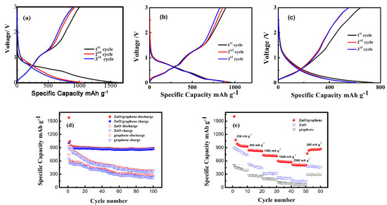 Figure 8a–c shows the first three-cycle performances of the ZnO/graphene, pure ZnO and graphene at a current density of 200 mA g−1. The discharge curve for the first cycle of the ZnO/graphene electrodes at 200 mA g−1 showed a plateau at 0.5–0.7 V, which can be linked to the reduction of ZnO into Zn. A platform at ~1.2 V on the corresponding charge curve was because of the reappearance of ZnO from Li–Zn alloy and Zn [27]. The excellent electrochemical capacity of the ZnO/graphene composites anodes was also attributed to the graphene in the composites; this can not only keep the electrode structure from collapsing, but also provides the electronic conduction during the charging and discharging processes and provides capacity at the electrode. The first discharge and charge capacities were 1583 and 1002 mAh g−1, respectively. Such a big difference is very likely due to the solid electrolyte interphase (SEI) formation as well as to the incomplete Zn oxidation relative to the initial ZnO amount. Charge and discharge capacities for the second cycle of the ZnO/graphene anode were the same, demonstrating good electrode stability. Compared with the ZnO/graphene composite, both the pure ZnO and graphene revealed low initial capacity (see Figure 8b,c), which is consistent with cycling performance (see Figure 8d)