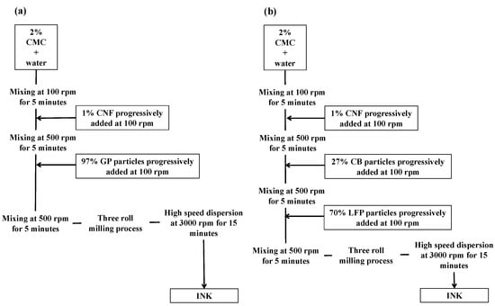 Flow chart of the formulation protocols used for the preparation of (a) negative and (b) positive electrodes.