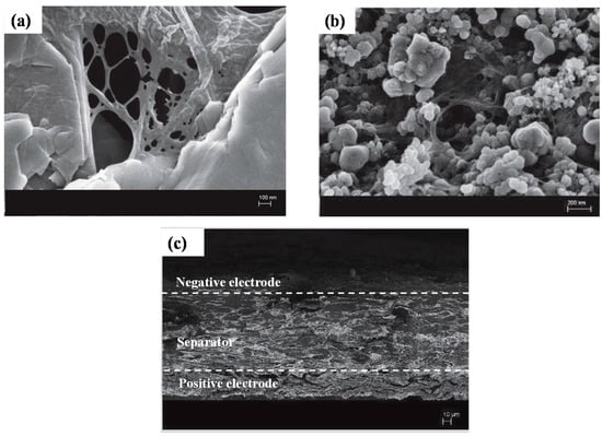 Field emission scanning electron microscopy (FESEM) images of surface electrodes and the printed battery. (a) Network structure between the graphite (GP) platelets and cellulose nanofibers (CNF) (mag: 50,000 ×, beam acceleration voltage: 3 kV, working distance 4.1 mm). (b) The same network structure has been observed for positive electrodes between lithium iron phosphate (LFP)/carbon black (CB) particles and the CNF network (mag: 20,000 ×, beam acceleration voltage: 3 kV, working distanceWD: 4.1 mm). (c) The cross-section of the full printed battery is showed with a three-layer structure corresponding to the separator and the positive and negative electrodes, and delaminations between the separator and the positive electrode are displayed (mag: 200×, beam acceleration voltage: 3 kV, working distanceWD: 4.2 mm).