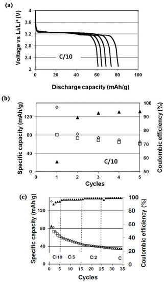 The electrochemical behavior of the cell was tested at ambient temperature using an Arbin Testing Systems S/N 170795. Galvanostatic charge–discharge cycling tests were performed. The cell was discharged and charged at a constant current rate of C/10 (i.e., 17 mA/g).