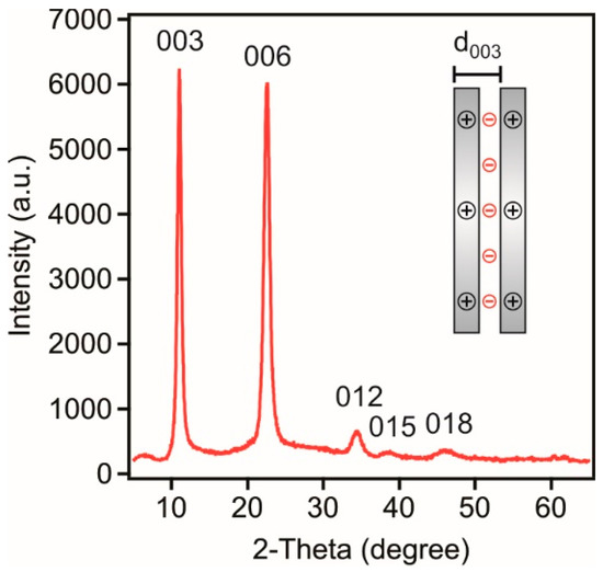 Indeed, the diffraction pattern unambiguously confirmed the formation of the LDH, since the typical Miller indices for LDH could be assigned to the obtained material [20,34,36]. The sharp (003) and (006) reflections indicate the good crystallinity of the lamellar compound. To quantitatively analyze the XRD peaks, the Bragg equation [37] was used to calculate the -spacing values as