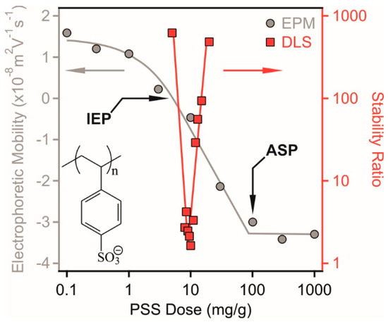 Positive EPM values were measured at low PSS doses due to the structural charge of the particles. The data decreased with increasing the polyelectrolyte dose indicating the PSS adsorption on the oppositely charged surface. Such an adsorption process led to charge neutralization at the isoelectric point (IEP), where the overall charge of the particles is zero. Further addition of the polyelectrolytes gave rise to charge reversal and the adsorption continued until the onset of the adsorption saturation plateau (ASP), which corresponds to the dose at surface saturation. The value of ASP was calculated from the intercept of the linear fits on the plateau and in the decreasing mobility regime. This dose was found to be 100 mg/g and the EPM data were constant after this value. In other words, the onset of ASP refers to the maximum amount of PSS, which is able to adsorb on the LDH and further added polyelectrolytes remain dissolved in the solution. Similar charge neutralization and reversal processes were reported in oppositely charged particle-polyelectrolyte systems [12,39,40] including LDH-containing dispersions [13].