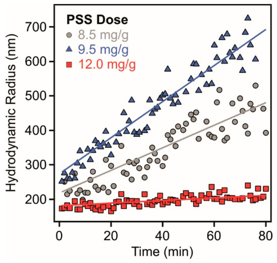 Hydrodynamic radii of LDH particles as a function of the measurement time in the presence of 8.5 mg/g (triangles), 9.5 mg/g (circles) and 12.0 mg/g (squares) PSS. The solid lines are linear fits used to calculate the apparent rates according to Equation (3).