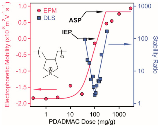 Electrophoretic mobilities (red circles, left axis) and stability ratios (blue squares, right axis) of LDH-PSS (100 mg PSS per one gram of LDH, which corresponds to the dose of the onset of the adsorption saturation plateau (ASP)) as a function of the poly(diallyldimethyl ammonium chloride) (PDADMAC) concentration. The measurements were performed at 10 mg/L particle concentration and 10 mM ionic strength adjusted by NaCl. The structure of PDADMAC is shown in the inset.