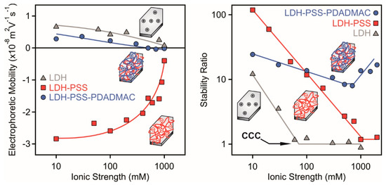 One of the limitations of the use of LDH particles in applications taking place in dispersions is their low resistance against aggregation induced by electrolytes, which are present in the majority of the application processes [36]. In general, LDH dispersions are stable at very low ionic strengths, but small amount of salts may cause particle aggregation [13,34,56]. The critical salt level, which separates the stable and unstable regimes, is the so-called critical coagulation concentration (CCC). Polyelectrolyte functionalization has proved to be powerful tool to improve the stability of LDH or other colloidal particles [13,14,35,57,58]. In other words, particles coated with a saturated polyelectrolyte layer possessed higher CCC values than the bare ones. However, systematic studies dealing with polyelectrolyte bilayer-functionalized particles are missing. Therefore, we measured EPM and stability ratio values of LDH-PSS and LDH-PSS-PDADMAC particles (the doses of PSS and PDADMAC in the composites were equal to the onset of the ASP in the individual systems) at different ionic strengths and compared them to the data obtained in the bare LDH system (Figure 5). In this way, the effect of polyelectrolyte layer formation on the resistance against salt-induced aggregation was probed. Note that in these experiments, the polyelectrolyte-modified particles were prepared first in salt-free environment and added to NaCl solutions to obtain the desired ionic strength.