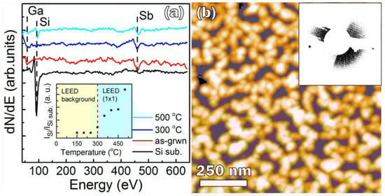 The evolution of the Auger spectra in the process of sample A formation; the inset is a dependence of the intensity of the silicon peak (92 eV) on the annealing temperature (the minimal temperature in the inset is the temperature of the Ga–Sb mixture after deposition) (а); atomic force microscopy (AFM) image of sample A after the final annealing at 500 °C for 15 min; the inset is a 1 × 1 LEED pattern that appears after annealing of the film at 300 °C for 15 min (b).