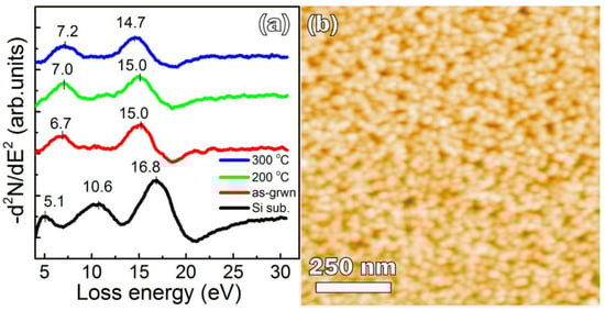 Therefore, for sample B, we increased the film thickness by about 50%—up to 20 nm—and set the maximum annealing temperature at 300 °C because at this temperature, there is no significant film aggregation, but it is high enough for GaSb formation []. After deposition of a 20-nm-thick Ga–Sb mixture, only GaSb peaks in the EELS spectrum were seen: at 6.7 and 15.0 eV [,] (Figure 3a). The peak at 15.0 eV is closer to the bulk plasmon in crystalline cubic GaSb (14.7–14.8 eV [] and 14.7 []) rather than in amorphous GaSb (14.3 eV []), so we can state that a crystalline GaSb film with a cubic F-43 m lattice was formed.