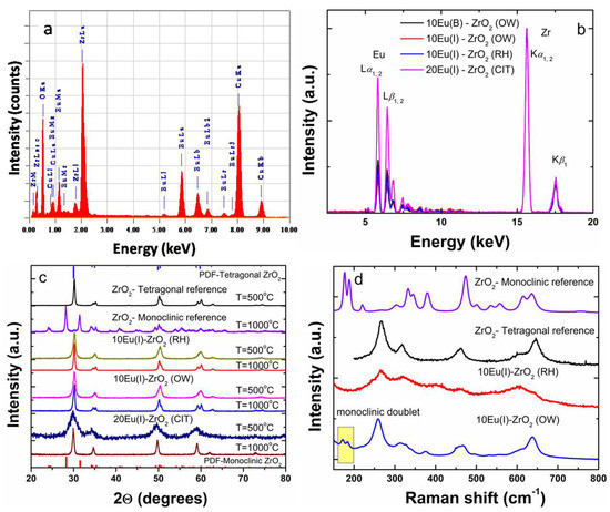 (a) Elemental chemical analysis using EDS (10Eu–ZrO2(OW)). The C and Cu peaks were present due to the copper grid provided with a carbon membrane; (b) XRF spectra of 10Eu(B)–ZrO2 (OW), 10Eu(I)–ZrO2 (OW), 10Eu(I)–ZrO2 (RH) and 20Eu(I)–ZrO2 (CIT); (c) XRD patterns, annealing temperatures of 500 and 1000 °C; and (d) selected Raman spectra, annealing temperature of 1000 °C.