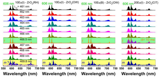 The main structural difference between monoclinic, tetragonal, and cubic phases of zirconia is given by the displacements of the lattice oxygen atoms; therefore, consideration of the local atomic structure is essential to fully understand the effect of doping on ZrO2 [3,4]. An effective approach for local structure investigations is based on Eu luminescence, which is highly sensitive to local symmetry. The local symmetry at the Eu site varies from low C2, (Cs or C1) symmetry in seven-fold coordination in monoclinic phase, to the higher symmetry (eight-fold coordination) of tetragonal (D2d) or cubic (Oh) phases. The emission properties of Eu in fully stabilized tetragonal/cubic ZrO2 (all obtained exclusively by bulk doping methods) are well documented in the literature and the reader can refer to References [6,10,11,15,16,17,18,19,20,25,27,33,35,36,38,46,47,48]. Usually, in these studies, the excitation was performed using UV that contained the absorption profiles of tetragonal ZrO2 [1] and O2−–Eu oxygen charge transfer [49] or f-f absorption transitions of Eu at 394 and 464 nm. To check on the homogeneity at the atomic scale of 10Eu(I)–ZrO2 (OW, RH) and 20Eu(I)–ZrO2 (CIT) (all samples at 1000 °C annealing), we have performed extensive low-temperature (80K), site selective, time-gated excitation spanning the UV to visible spectral range. A selection of emission/excitation spectra obtained under excitation across the 7F0-5D2 hypersensitive transition around 464 nm is illustrated in Figure 3 and Figure 4.