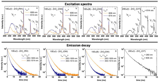Several general characteristics emerge from the comparison of emission spectra in Figure 3: (1) The emission shape characteristic of the 5D0 level of Eu changes with the excitation wavelength while the associated width varies from 1 to 10 nm, which sustains the coexistence of both ordered and disordered local environments. (2) The spectral feature around 606 nm characteristic of Eu substituting for Zr in tetragonal sites [17,18,19,27,30,49] (with no defect nearby or not locally charge-compensated) can be observed at selected wavelengths. In tetragonal ZrO2, the eight-folded Zr(4+) has two sets of short (2.17 Å) and long (2.36 Å) Zr–O bond lengths, which define a D2d inversion, that is a less symmetrical environment around Zr [3]. The well-known emission fingerprint of Eu in tetragonal zirconia is given by two emissions bands of comparable intensity at 591 nm (corresponding to the merging of the two permitted 5D0-7F1 transition lines) and ≈606 nm (which is the strongest among the four allowed 5D0-7F2 lines), (the green highlighted spectra in Figure 3). (3) Basically, there are no differences observed between the emission shapes when comparing the wet impregnated and bulked doped samples (OW). (4) The excitation modes and emission dynamics are similar across OW and RH samples (Figure 4). This means that not only the electronic interactions between the dopant and zirconia host (excitation spectra), but also the balance between the radiative (local symmetry) and non-radiative transition probabilities (due to interaction between Eu ions or between Eu with structural and surface defects) are similar across the three samples. (5) For the 20Eu(I)–ZrO2(CIT), the Eu local environment is remarkably homogenous, as shown by the constancy of the emission shape with the excitation wavelength. The emission is broader as compared to typical emission of RH and OW samples, as a result of the enhanced amount of oxygen vacancies generated by the higher Eu concentration. Most of these apparently locate near to Eu, since the fingerprint emission of Eu in tetragonal sites at 606 nm can be separated only under time-gated emission conditions (using at least 10 ms delay after the laser pulse).
