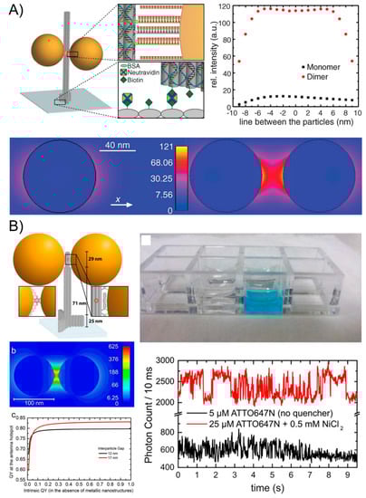 - Acuna, G.; Möller, F.; Holzmeister, P.; Beater, S.; Lalkens, B.; Tinnefeld, P. Fluorescence enhancement at docking sites of DNA-directed self-assembled nanoantennas. Science 2012, 338, 506–510. [Google Scholar] [CrossRef] [PubMed]